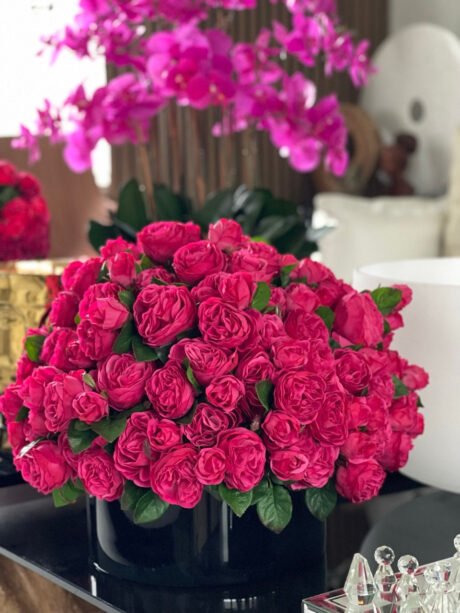 Dark Pink English Roses in Black Glass Plate Vase