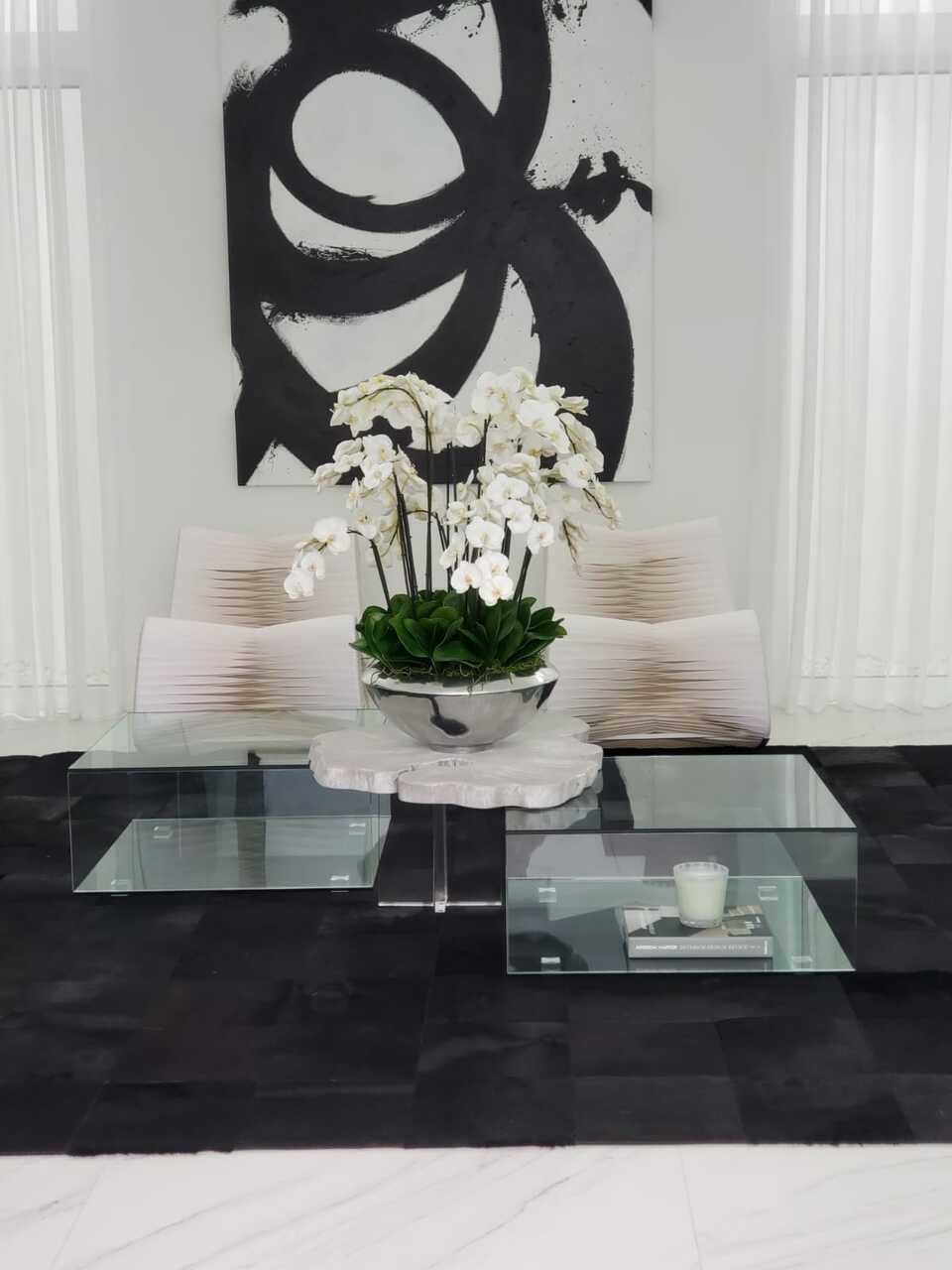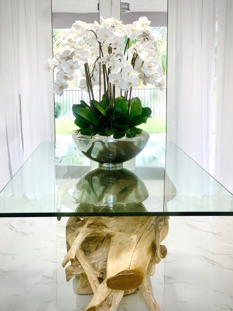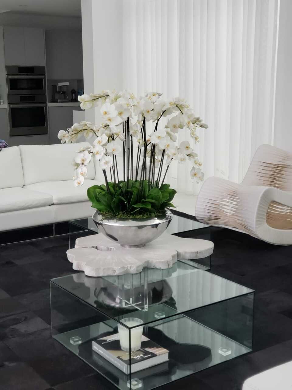 Graceful and exotic. the white orchid has symbolized integrity. nobility. and luxury for centuries. Our enduring. snow white phalaenopsis arrangement captures the artistry and spirit of natural orchids. It’s prized for its profusion of perfect blooms. Vertical bamboo stakes. broad green leaves. and a genuine moss base add to the realism of this arrangement.Often called the moth orchid. the phalaenopsis is a favorite among our designers for its dense leaves. elegantly arching sprays and lovely white blooms. Our remarkably lifelike arrangement is staked into a moss-covered silver avenue bowl for a timeless. authentic look that will endure for years to come. This arrangement is just the right size and is versatile enough to use as a coffee table centerpiece. a dining room or console table. It has a luscious tropical feel that will add vibrancy and elegance to any room.