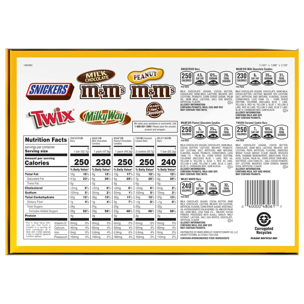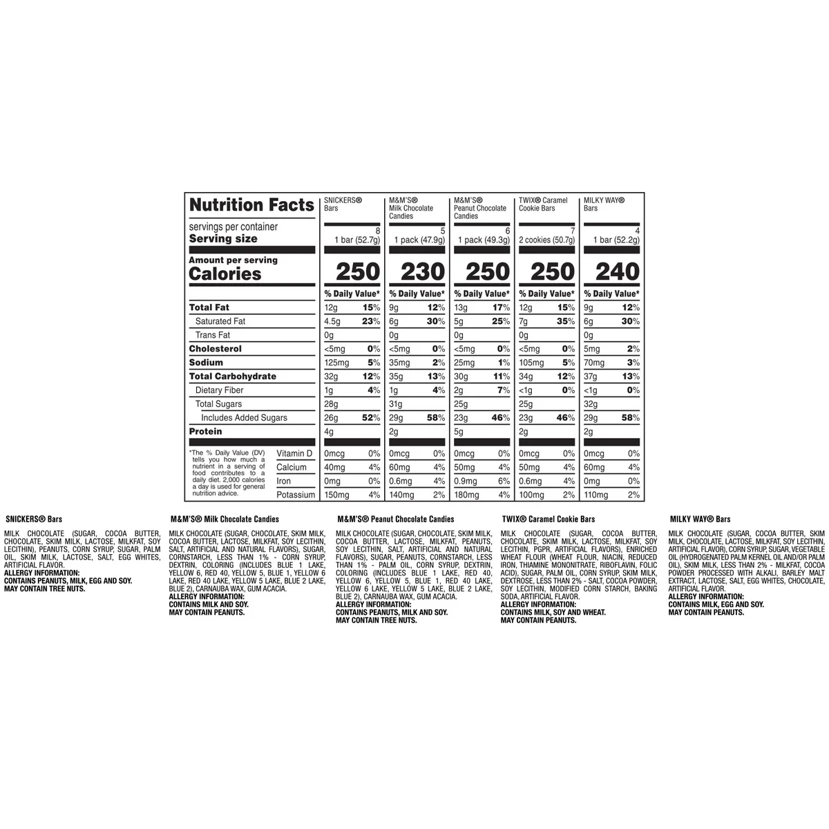 Mars 30ct Full Size Candy Variety Pack. 53.66 Ounce. 8 x Snickers Bars. 7 x Twix Bars. 6 x M&M’S Peanut. 5 x M&M’S Milk Chocolate. 4 x Milky Way Bars